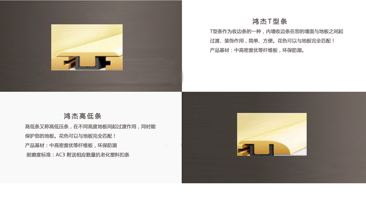 專業(yè)生產(chǎn)各類地板輔料。本廠成立于2008年,經(jīng)過嚴(yán)格的質(zhì)量控制,已開發(fā)出SPC、WPC、層壓板三種不同的壓花材料。每一種材料都有超過7種不同的過渡型材,如t型線、減速器、端蓋、四分之一圓、樓梯前鼻、樓梯板、踢腳板等。    SPC和WPC是我們的新產(chǎn)品,在世界各地越來越受歡迎。各種造型將達(dá)到您的個(gè)性化需求,100%匹配您的SPC, WPC或乙烯基地板的顏色。     我們的傳統(tǒng)產(chǎn)品——層壓板是世界領(lǐng)先的產(chǎn)品之一,具有熱壓耐磨層加工技術(shù),高溫高壓。其質(zhì)量可靠,品種齊全,經(jīng)久耐用,耐磨,使層壓板成型經(jīng)久不衰。     我公司不僅與國(guó)內(nèi)一些大型、信譽(yù)良好的地板生產(chǎn)廠家和代理商建立了長(zhǎng)期的合作關(guān)系,產(chǎn)品還出口到臺(tái)灣、日本、菲律賓、美國(guó)、加拿大、非洲、澳大利亞、歐洲等國(guó)家和地區(qū)。 歡迎來廠參觀、洽談業(yè)務(wù)。